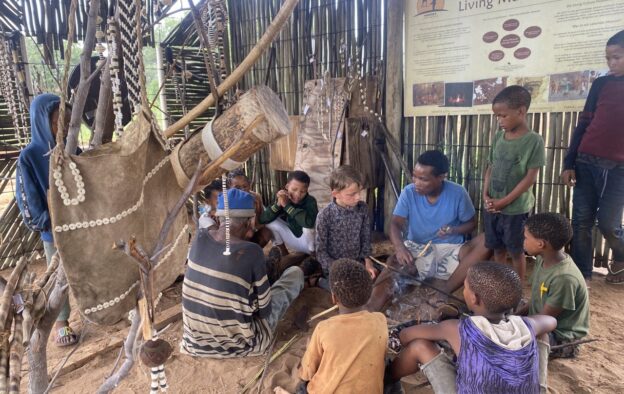 Een “tribal” uitwisseling van de San Tribe met Light Tribe in Ju/’hoansi-San Living Museum en andere dorpen rondom Tsumkwe in Namibië. Kinderen wisselen kennis uit en leren van elkaar hoe zij hun autonomie en bewustzijn verrijken door een week lang samen te leven en te werken met wilde dieren en bushkinderen.